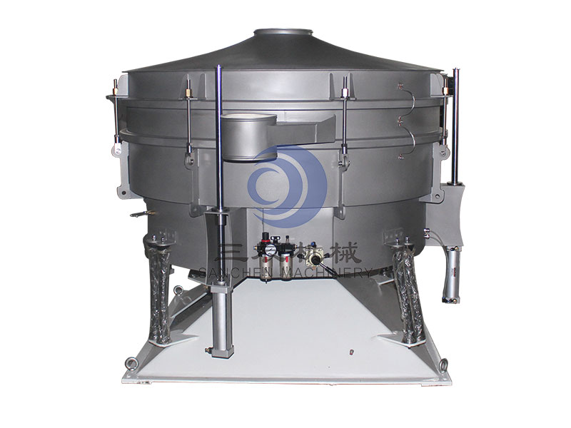 從運行軌跡來看,搖擺篩是一種非線性慣性振動篩,基本的回轉(zhuǎn)運轉(zhuǎn)與人工篩分相類似。偏心率從25到40mm可調(diào),低速V型皮帶驅(qū)動從120到360rpm可調(diào)。每一種產(chǎn)品的停留時間可以通過搖擺篩的徑向與切角朝驅(qū)動軸線方向進行調(diào)整。因此建立水平與拋擲三維翻滾運動。物料從中心到外緣在整個篩面上均勻分散,從而以螺旋運動往軸向傳播。細(xì)小顆粒從而完成了整個篩分過程。水平與垂直加速度隨著粒子的運動而增加,接近篩孔尺寸的顆粒隨之成功分離;較大顆粒被運到出口處,出口處有一個可調(diào)節(jié)的導(dǎo)向裝置控制流量,該導(dǎo)向裝置是控制物料停留時間的另一個因素。