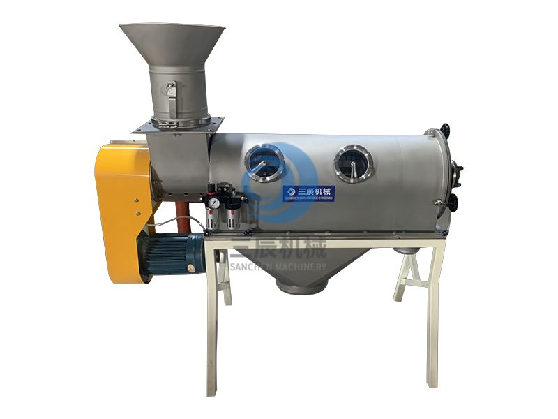 篩機(jī)由電機(jī)、機(jī)座、篩箱、進(jìn)出料推進(jìn)裝置等組成。物料由料斗經(jīng)螺旋輸送進(jìn)入篩箱,分流葉片連續(xù)轉(zhuǎn)動(dòng),形成了物料在篩箱內(nèi)不斷的更新推進(jìn),使物料產(chǎn)生運(yùn)動(dòng)沖向篩網(wǎng),細(xì)料通過(guò)篩網(wǎng)落入成品倉(cāng),粗料繼續(xù)向前推進(jìn),在粗料口排出,從而達(dá)到理想的篩分效果。